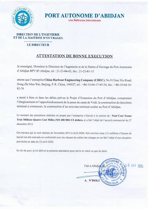 近日,科特迪瓦阿比让港口扩建项目部获得业主阿比让自治港港务局颁发的良好施工(1100万安全工时)证明。