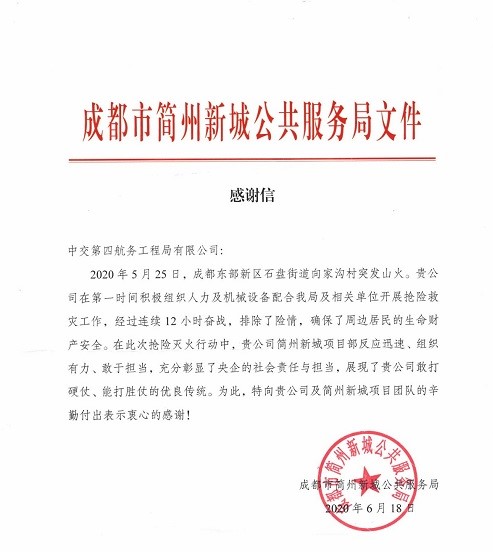 信中指出,项目团队在成都市东部新区石盘街道向家沟村火灾发生的第一时间,积极组织人力及机械设备配合成都市简州新城公共服务局及相关单位开展抢险救灾工作。经过连续12小时的奋战,排除了险情,确保了周边居民的生命财产安全。在此次抢险灭火行动中,简州新城项目部反应迅速、组织有力、敢于担当,充分彰显了央企的社会责任与担当,展现了敢打硬仗、能打胜仗的优良传统。
