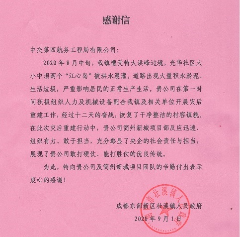 近日,成都市壮溪镇人民政府向公司发来感谢信,对公司成都简州新城项目部在壮溪镇灾后重建工作中的辛勤付出表示感谢。