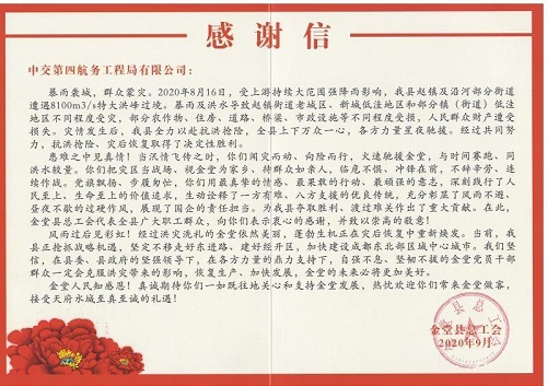 近日,成都市金堂县总工会向公司发来感谢信,对公司成都温江项目部在金堂县抗洪抢险、灾后恢复工作中的辛苦付出表示感谢。