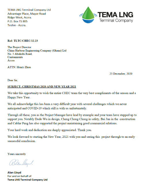 12月23日,加纳特码LNG项目收到业主TLTC发来的感谢信。信中对2020年项目团队取得的各项成绩表示高度赞赏,同时向项目全员致以圣诞元旦双节问候。