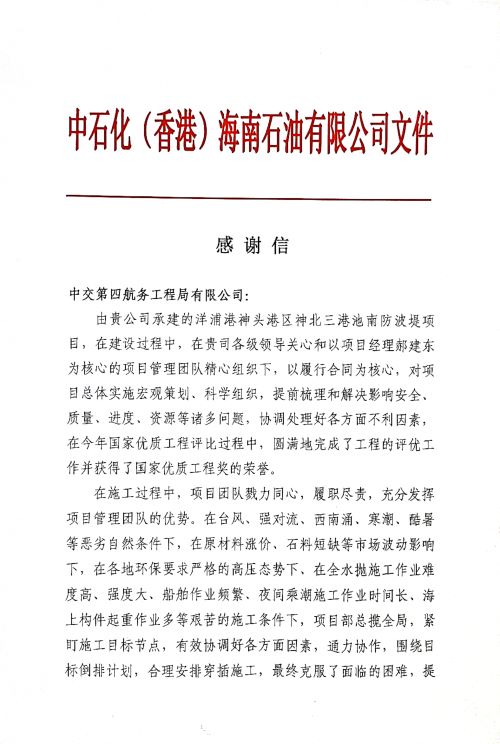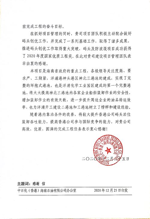 12月25日,四航局收到业主中石化(香港)海南石油有限公司的感谢信。信中对项目团队积极主动配合做好码头创优工作,并获得2020年度国家优质工程奖表示由衷的感谢。