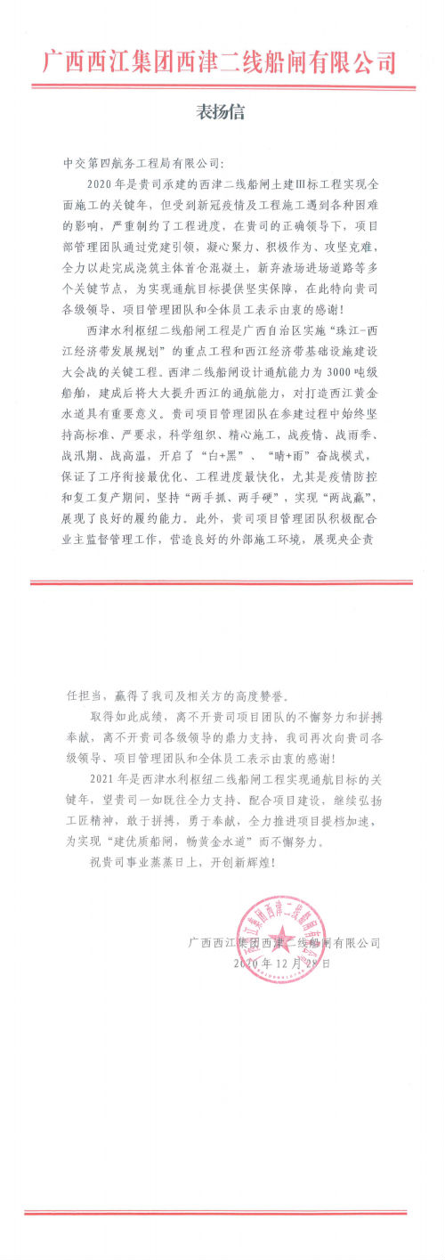 近日,公司西津项目部收到业主广西西江集团西津二线船闸有限公司发来的表扬信。