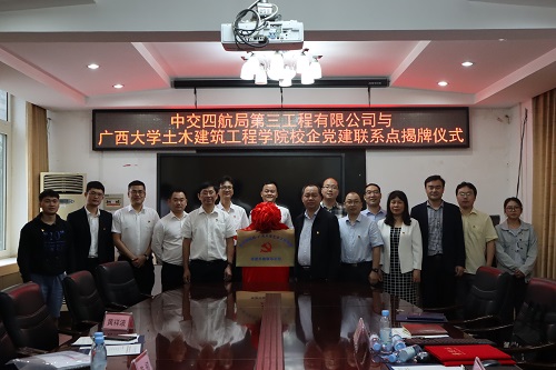 4月27日,公司党委书记黄祥波拜访广西大学土木建筑工程学院党委书记戴永恒,并在学院会议室揭牌党建共建联系点、签订校企协议。学院常务副院长陈正和相关领导参与会谈。