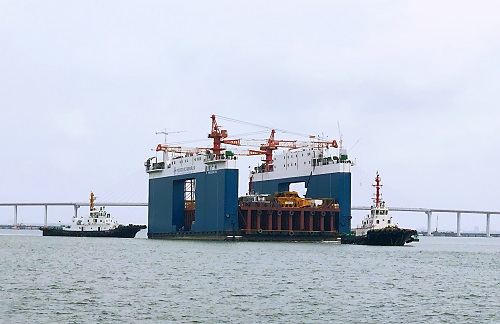 4月1日,在湛江海事局“海巡船09057”的护航下,装载着拖船“粤工拖45”的“四航广州”半潜驳船在湛江港两艘大马力拖轮的拖带下,离开公司船机中心码头,远航越南薄寮海上风电项目作业。