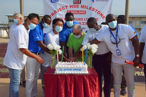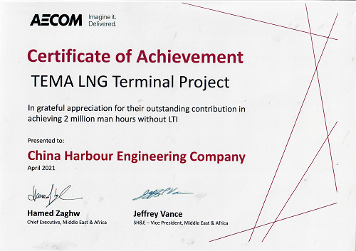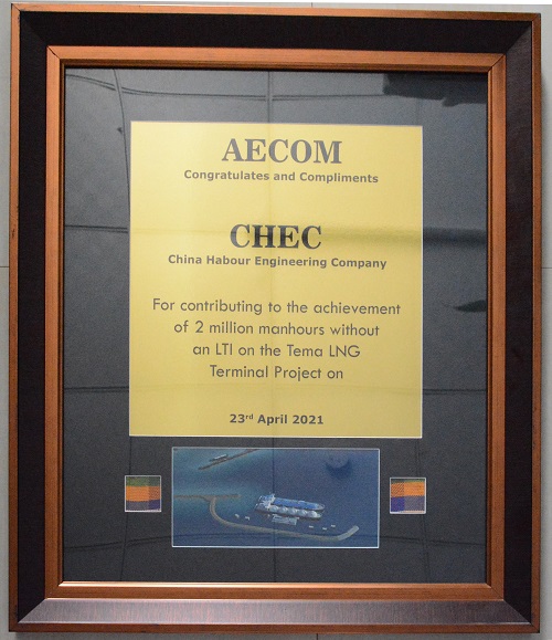 4月23日,由中国港湾承建、公司参建的加纳特码LNG码头工程项目荣获200万安全工时证书并举办200万安全工时庆典,业主TLTC、咨工AECOM、项目管理人员及当地劳工代表参加。