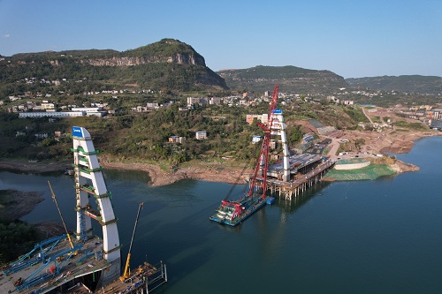 万州北滨路项目是集道路建设、库岸及消落区整治和滑坡治理于一体的综合性建设项目。目前,该项目水利部分已完成库岸桩基、托梁、抗滑桩及挡墙施工;市政部分双溪铺大桥主塔已封顶、边跨钢箱梁已安装完成,正进行中跨钢箱梁的安装。