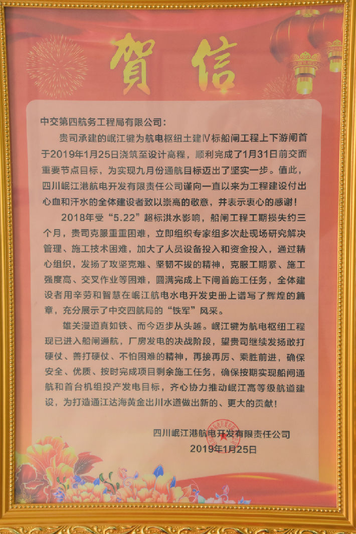 日前,公司收到业主发来的贺信,对公司顺利完成岷江犍为航电枢纽土建Ⅳ标船闸工程重要节点任务表示感谢。