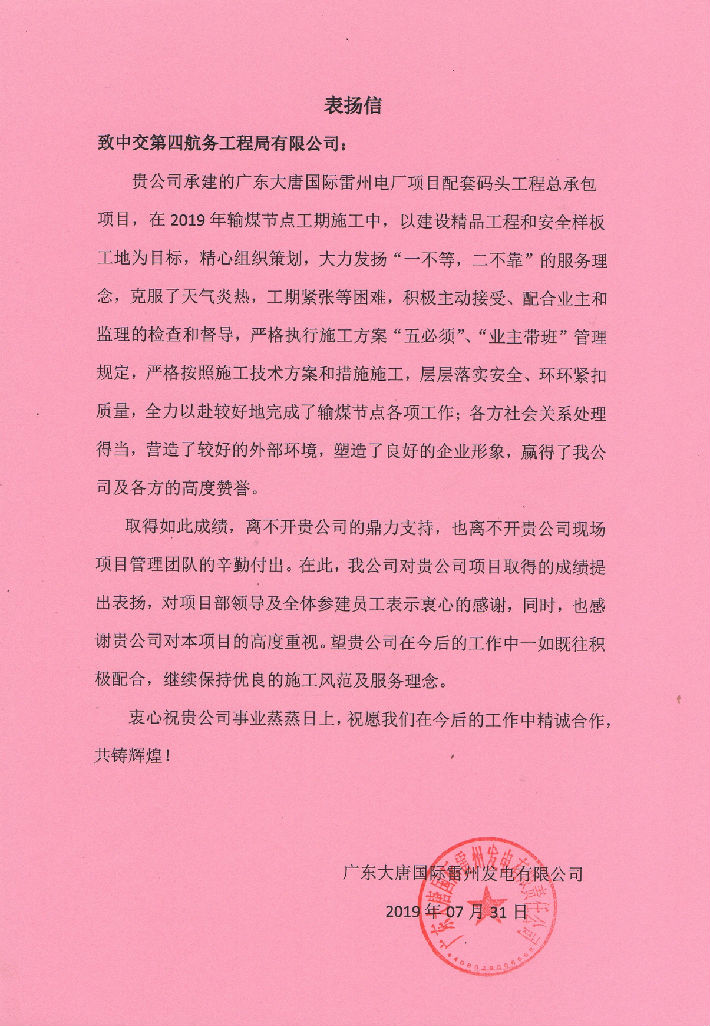 7月31日,公司承建的大唐雷州电厂配套码头项目收到业主表扬信,对项目部出色完成输煤节点任务提出表扬。