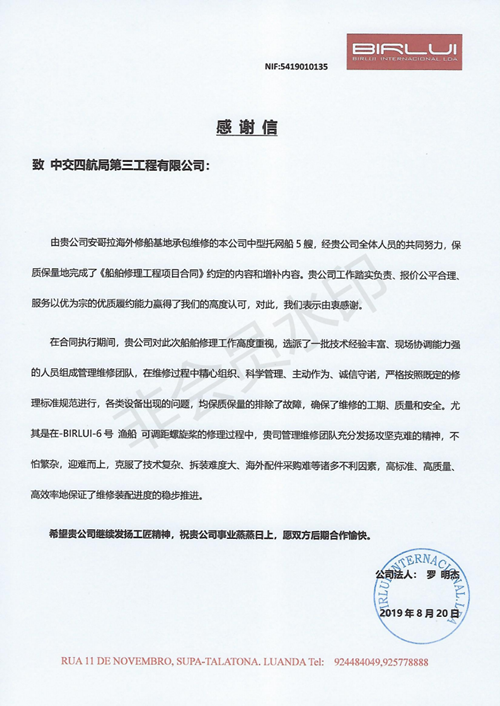 8月20日,公司收到BIRLUI公司发来的感谢信,对公司安哥拉修理厂管理维修团队工作踏实负责、技术素质过硬、优质履约能力表示肯定以及感谢。