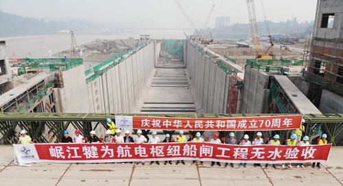 此次通过无水阶段验收的船闸工程包括船闸主体工程、上引导航道及靠船建筑物、下引导航道及靠船建筑物,全闸总长约1334.34米,共浇筑混凝土53万立方米。无水阶段验收会上,验收委员会专家们认真听取了项目建设、设计、监理、施工单位的汇报,查阅了内业资料,并对工程现场进行了详细的检查,专家组一致认为岷江犍为航电枢纽船闸工程符合设计要求、验收资料齐全规范、工程质量评定合格,同意通过无水阶段验收。