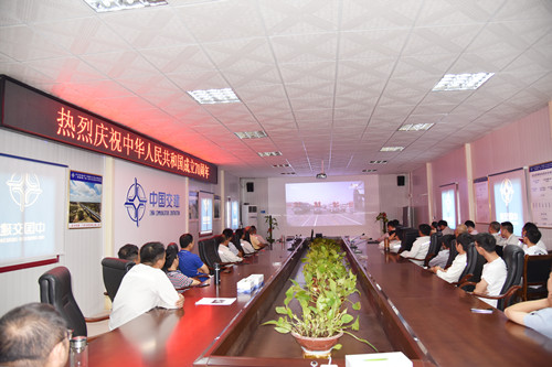 海口路桥项目部组织在岗员工在会议室观看国庆阅兵直播。