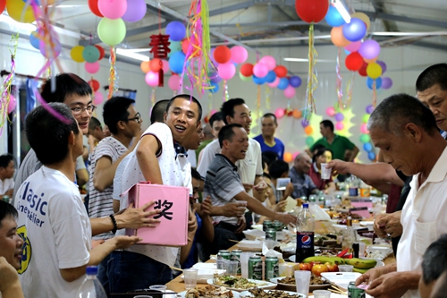 迎新春系列活动分为“玩游戏,赢大奖”和除夕团年饭两个环节。活动由《四航之歌》拉开序幕,接下来“假话连篇”、“抢凳子”等传统游戏暖场,台上的参赛者是你争我抢,红包奖品不断,台下的观众也都跃跃欲试,最后由“你飞我接”、“抢红包”等自创游戏把整个活动推向了高潮。项目部全体员工轮流登台参与游戏,大家都乐在其中,整个游戏环节持续了一个半小时。团年饭开始前项目经理、项目书记分别致新年贺词,分享2015年的收获,憧憬2016年的美好,为整个项目团队注入激情和动力。(科特迪瓦项目部 李松林)